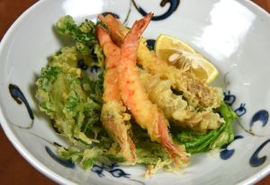 フトミゾエビの天ぷら 小振りなので細くと頭部の節だけは残して揚げた。大きいものはこの部分は取り去ってもいい。背わた、額角部分を取り、よく水分をきる。これを衣をつけて強火で揚げる。エビらしい風味、甘味が強く、ぷりっとした食感もある。実に美味。クリックで閉じます![]()