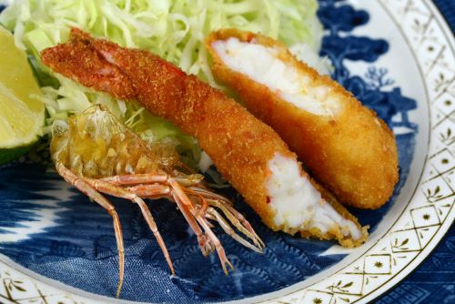 フトミゾエビのフライ クルマエビ科といったらフライである。大型が手に入ったらぜひとも作りたい、そんな料理である。