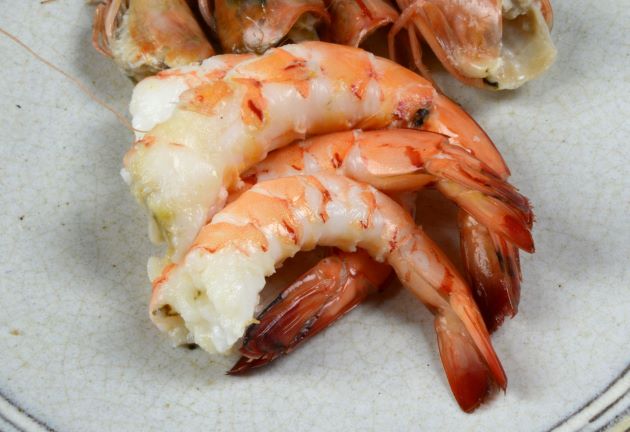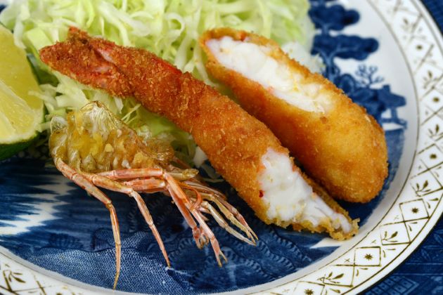 頭部の殻を取り、脚の部分をていねいに洗って乾かす。胴の部分は背わたを取り、尾だけを除き殻を剥き、尾羽根の先を切り落とす。曲がらないように腹部に切れ目を入れ、親指などでつまみ、筋肉を軽くつぶす。油を熱して、まずは脚を素揚げにする。胴の部分は塩コショウして小麦粉をまぶし、溶き卵をくぐらせ、パン粉をつけて高温で揚げる。柑橘類などを添える。