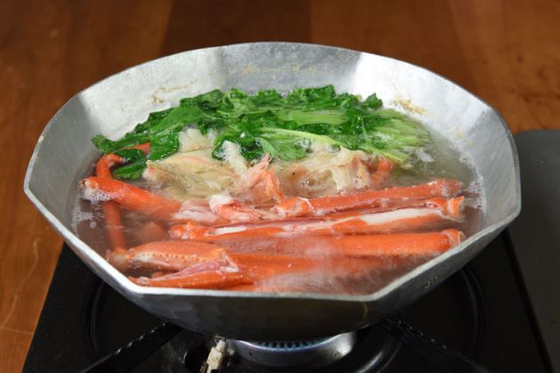 ベニズワイガニのかにちり 活けをばらして、昆布だしで煮ながら食べるもの。大勢で一気に食べるのがいい。火の通し加減はお好みで。また野菜を加えた「かにすき」もいい。最後は必ずぞうすいでしめたい。