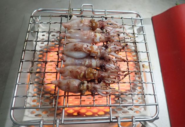 ホタルイカはパレットにのったものをそのまま、強火で焼き上げる。完全に火を通さないと寄生虫の問題があって危険であるために、半生は厳禁。