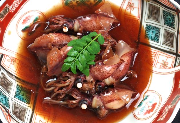 ホタルイカの煮つけ 生は流通してきたものはそのままで、関東などで揚がったものは流水などで汚れを落とす。水分をよくきり、酒・砂糖・醤油を煮立てた中で数分絡めながら煮る。これを1時間程度鍋止めにする。甘辛く柔らかく、内臓のうま味と非常に美味。クリックで閉じます![]()