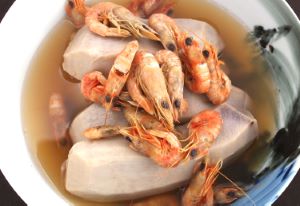 ホッコクエビの塩ゆで もっとも簡単なのはゆでることだ。流水でざっと洗い、水分をきる。これをたっぷりの塩水を沸かした中で2〜3分くらいゆでておか上げにする。身のうまさ、エビの風味などはもちろん申し分がないが、頭部のみそも美味だ。クリックで閉じます![]()