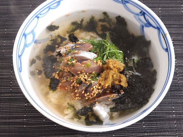 りゅうきゅう(茶漬け/マイワシのづけ) 三枚に下ろした身の小骨を抜き、小さめに切りつける。これをしょうゆ、みりん、ごまの地につけ込んだもの。これをご飯にのせてそのまま食べる。また茶漬けにしてもいい。