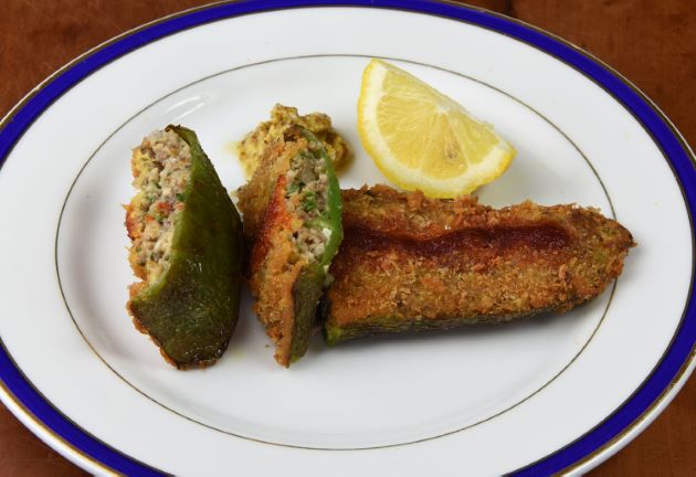 いわしのミンチカツピーマン詰め(マイワシのメンチカツ) 水洗いして手開き、片身にして背鰭周り、中骨を取る。細かく切り、ミンチ状に包丁で叩く。湿らせた食パンもしくは水を抜いた豆腐に小麦粉、ナツメッグ、カイエンヌペッパー、塩で味つけしてまとめ上げる。これに衣(卵・小麦粉・水)を絡めてパン粉をつけて揚げる。ここでは大きめのピーマンにつめて揚げた。