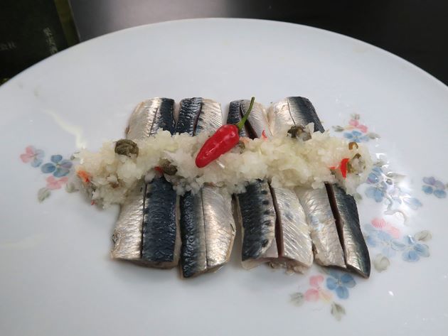 イワシのマリネ(マイワシのマリネ) 手開きして塩でしめた片身を、マリナードに半日漬け込んだもの。マリナードはワインビネガー、マルサラ酒、白ワイン、砂糖、乾燥タイム、乾燥ディルを合わせたもの。マリナードに漬け込んだ玉ねぎのみじん切りとケーパー、赤唐辛子を和えたものを添えた。白ワインにとても相性がいい。