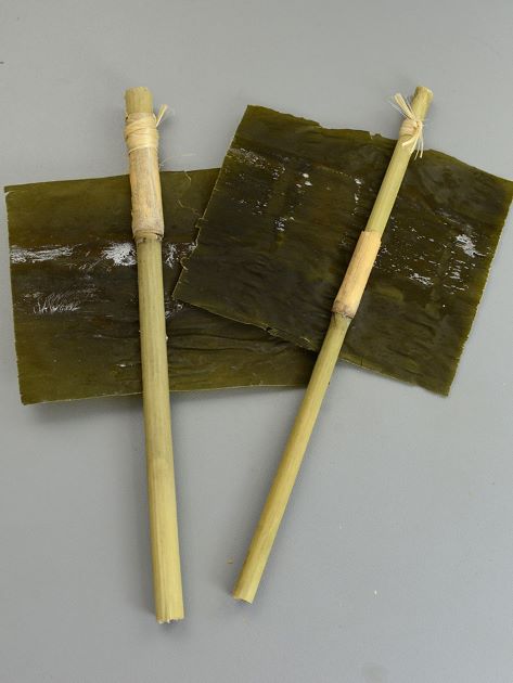 火清鳴弦昆布(ひきめんこんぶ) 4月中旬の3日間行われる「火清鳴弦御祈祷(お弓神事)」に参列する氏子は、祈り折り畳んだ昆布を白紙で包み30cmくらいの串に挟んで奉納して祓いを受ける。この昆布は持ち帰り、食べて体内部まで清める。[風浪宮 福岡県大川市]
