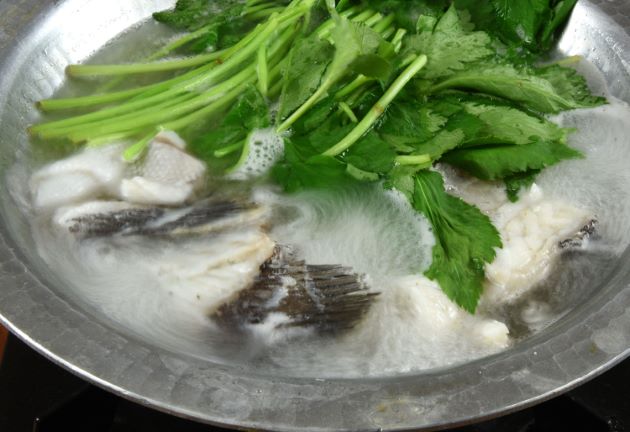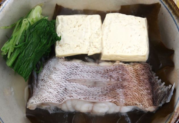 マハタの鍋 水洗いして、刺身などにしたときのあら、切り身などを湯引きし、氷水に落として鱗などを取り去る。水分をよくきり、昆布だしに酒・塩で煮ながら食べる。とても味わい深い汁が出来上がる。汁だけのんでも満足感がある。身離れがよく皮目に甘みがあって非常に美味。クリックで閉じます![]()