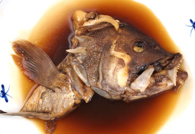 マハタの兜煮(煮つけ) 5kgの小型を水洗い。頭部を梨子割りにして、湯通しして冷水に落として鱗やぬめりを流す。これを酒・砂糖・しょうゆ味で比較的こってりと煮上げたもの。ハタの頭部の皮は分厚くて、熱を通すとゼラチン質になる。これが実に甘い。身離れもよくことのほか美味。クリックで閉じます![]()