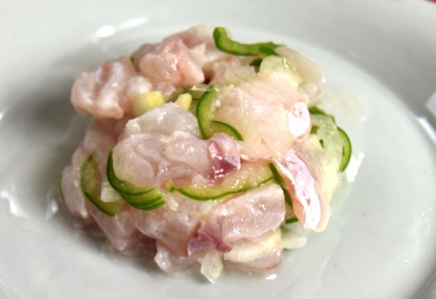マハタのセビチェ 水洗いして三枚に下ろし刺身などにする。どうしても余る部分が出るので、やや細かく切る。これを青唐辛子の細切り、玉ねぎのせん切り和える。塩とライムで味付けして30分前後寝かせる。塩辛さに、唐辛子の辛味が加わってとても爽やかな味わいになる。スピリッツに合う。クリックで閉じます![]()
