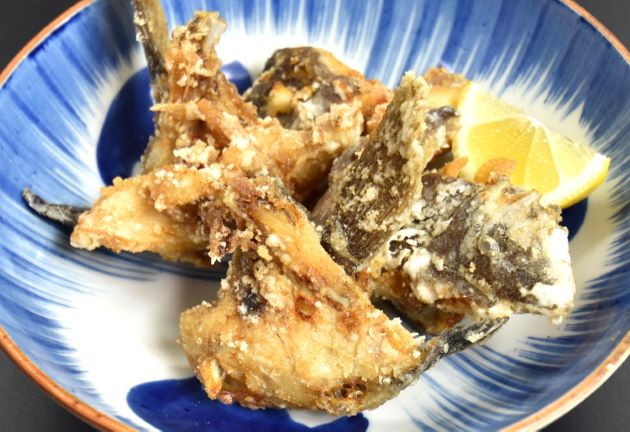 マハタの唐揚げ 頭部や胸鰭周辺にはたっぷりと筋肉が着いている。これを適当な大きさに切る。片栗粉をまぶしてじっくり二度揚げにする。熱を通すと鶏肉のように締まる。噛みしめると繊維質のほぐれを感じ、甘味が強い。鰭などとても香ばしい。クリックで閉じます![]()