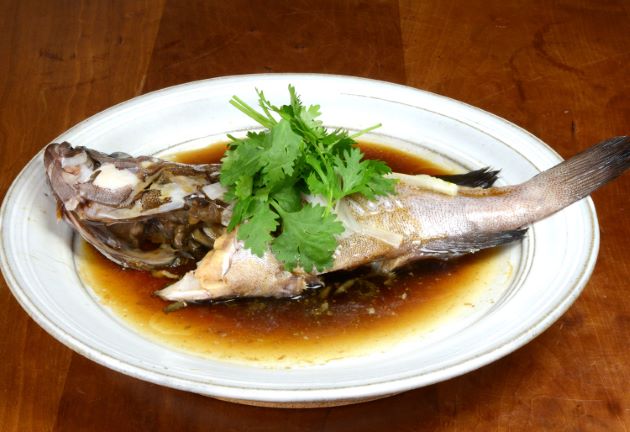 マハタの蒸魚(清蒸) ハタ類の代表的な料理法で、世界中で人気が高いのが「蒸魚」である。鱗はブラシなどで徹底的に取る。大型はすき引きする。また小型は丸のまま、大型は切り身、兜などを使うといい。水洗いしたら水分を徹底的に拭き取る。皿にねぎなどを渡し、魚をのせて酒を振り、ねぎやしょうがを乗せる。これを10〜20分くらい蒸す。蒸し上がったらたれ(醤油・魚醬・少量の紹興酒・砂糖を合わせて一煮立ちさせたもの。中国の甘い醤油でもいい)をかけねぎや香菜などを乗せて煙が出るくらいに熱した油をかける。酒の肴というよりもご飯がすすむ一品である。