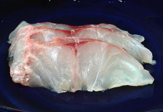 マルクチヒメジの刺身 水洗いして三枚に下ろす。皮を引き素直に刺身にする。本種の沖縄県での産卵期は不明だが、本州のホウライヒメジが夏に旬を迎えるのに対して、春に向けて秋から春に旬を迎えるのかも知れない。秋の個体は脂がのっていて身に甘味があった。