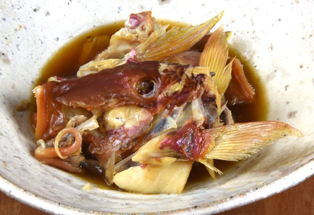 マルクチヒメジのあら煮(煮つけ) 比較的大きな魚なので刺身したときなどはたっぷりあらが出る。集めて置き、湯通しする。冷水に落として残った鱗とぬめりを流す。水分をよくきり、酒・砂糖・醤油・水が沸いた中で煮る。こってり甘辛に似てご飯のおかずにしてみた。実にうまし。クリックで閉じます![]()