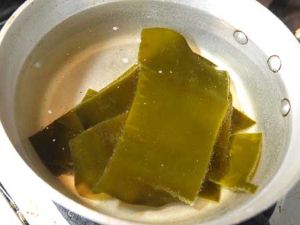 だしを取るには予めコンブを沈めておき、徐々に温めていく。