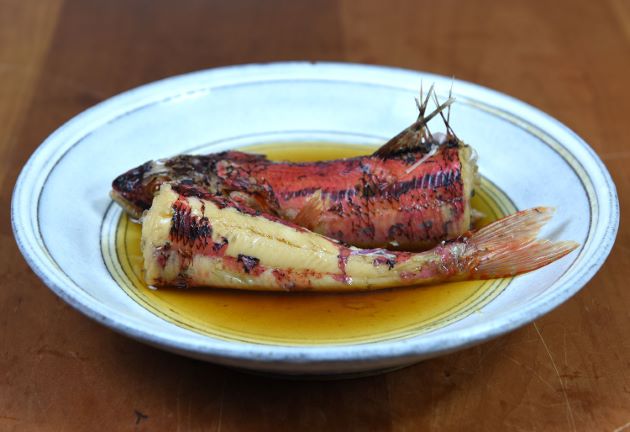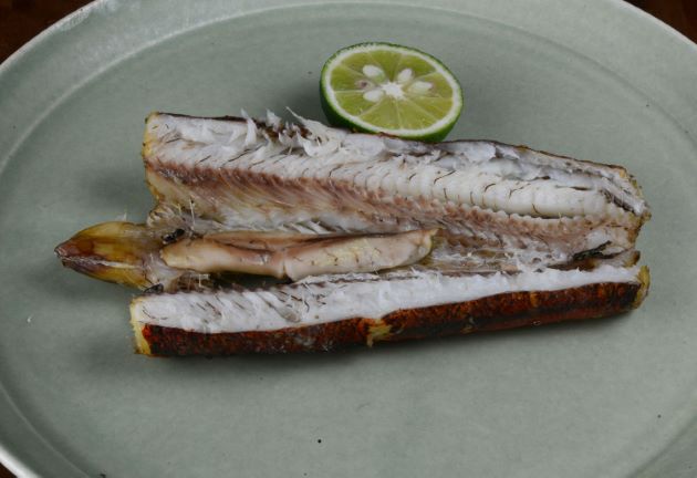 アカエソの塩焼き 水洗いして尾鰭と背鰭などを切り取る。振り塩をして1日寝かせる。これをじっくり焼き上げる。焼き上がりに背を割り、中骨をぬく。小骨は長く細長い。煩わしいが思ったほどはやっかいではない。皮のうまさ上々、身は豊潤で味わい深い。クリックで閉じます![]()