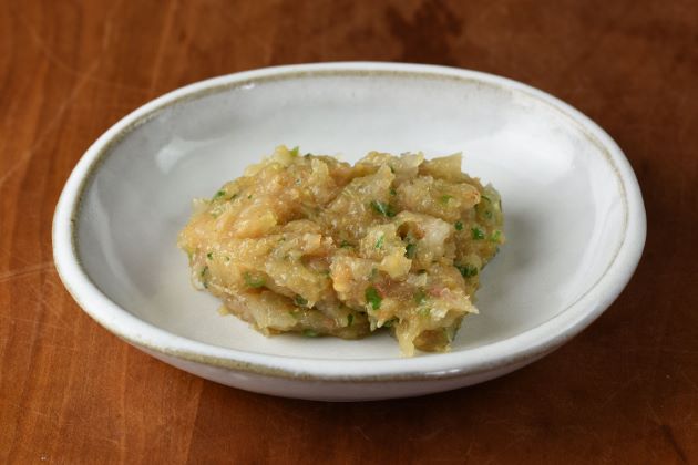 ミナミアカエソのみそたたき(なめろう) 鱗つきのまま三枚に下ろして身をスプーンなどでかきだす。これにみそ・しょうが・ねぎなどを加えてとんとんと粘り気が出るまでたたく。身はぼろぼろするがうま味豊かで非常に味わい深い。
