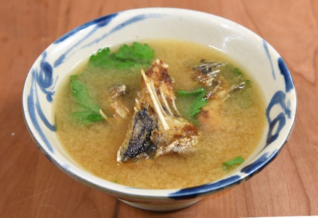 ミナミイスズミの素揚げみそ汁 石垣島のウミンチュは素揚げにしたイスズミ・クロハギ類をみそ汁にする。こうすると多少臭みのある固体もおいしく食べられる。単純に生をみそ汁にしたものよりも、うま味が豊かになる。