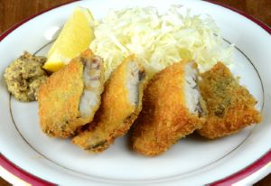 フィレの真ん中あたりを使った。血合い骨を抜き、水分をていねいに布巾などにくるみ抜く。塩コショウして小麦粉をまぶし、溶き卵をからめ、パン粉をつけて揚げる。