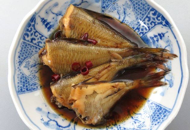 ひうちざこの煮つけ ミナミハタンポ、ミエハタンポをで煮つけにする。[鹿児島県南さつま市野間池]