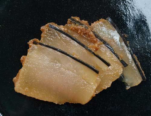 味噌漬け/新潟県などで作られるもの。生の黒皮(表皮のついた皮下脂肪)を味噌漬けにしたもの。生のまま切って食べる。