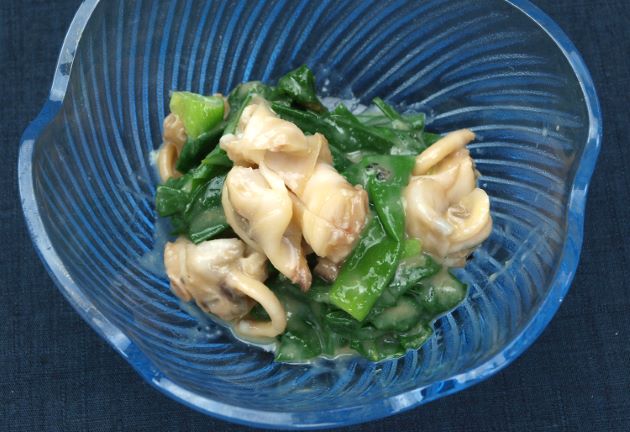 ミヤコボラのぬた 塩ゆでして身を取り出し、たまに泥を噛んでいるのがあるのでゆで汁のなかで洗う。これを冷たく冷やしてゆでた葱と合わせて、酢みそで和える。ミヤコボラはゆでても硬くならないので酒の肴によし。クリックで閉じます![]()