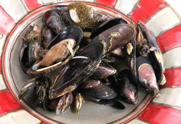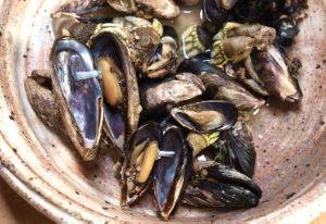 ムラサキインコの酒蒸 清酒で蒸し煮にする。流水などでていねいに汚れを落とす。水分をよくきり蓋が出来る鍋に入れて酒を加え、蒸し煮にする。軟体は硬く締まらず、うま味豊かでとても味わい深い。