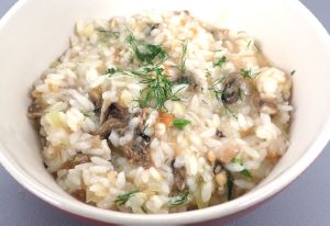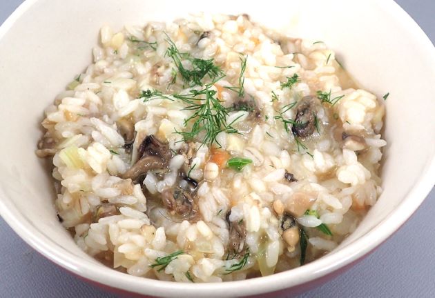 ムラサキインコのリゾット まずはゆでる。ゆで汁と貝を分け。身を取り出して置く。玉ねぎをオリーブオイルで炒め、米(ごはん)と押し麦を加える。少し炒めてゆで汁を加え、ローレルを入れて煮る。仕上げにオリーブオイルと粉チーズを入れ、かき混ぜる。仕上げにディルを散らす。