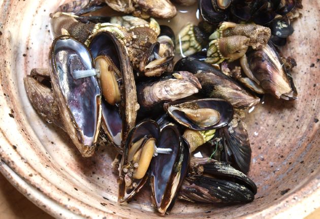ムラサキインコのワみそ汁 もっとも基本的な料理法がみそ汁である。採取したら付着している泥や海藻類などをていねいに落とす。足糸などについている貝殻などは包丁の背でこそげ取るといい。