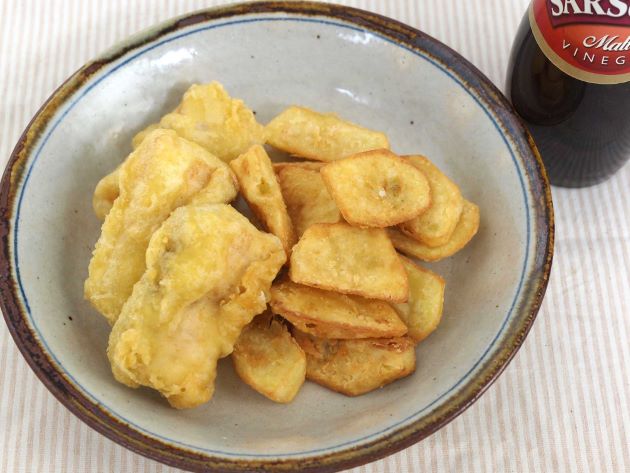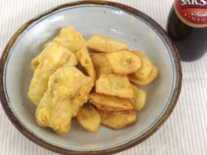 メカジキのフィッシュ&チップス メカジキの切り落としなどを集めて、塩コショウする。これに小麦粉をまぶして、ビールで小麦粉をといた衣で、ジャガイモと一緒にさくっと揚げる。衣の表面はかりっと香ばしくなかはしっとりと揚がる。とても味わい深い。クリックで閉じます![]()