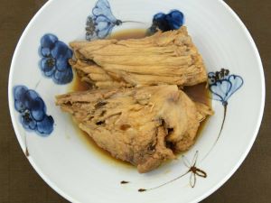 ハーモニカの煮つけ(メカジキの鰭下の煮つけ) 鰭下の部分を適宜に切り、湯通ししてぬめりなどを流す。これを酒・みりん・しょうゆ味であっさりと煮上げたもの。ご飯のおかずなら砂糖などを使って甘めに煮るといい。味つけはあくまでも自分好みに。薄い骨を外しながら食べるととても幸せな気分になる。そんなおいしさだ。クリックで閉じます![]()
