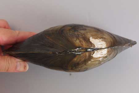 殻長25センチを超える大型二枚貝。若い個体は緑色がかった黒で大きくなるにしたがって、より黒くなる。殻高があり、台形に近い、後背縁は明瞭に湾入し靴型になる。膨らみは強い。