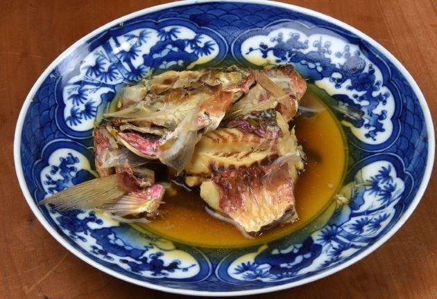 モンツキアカヒメジのあら煮(煮つけ) あらを集めて置く。湯通しして冷水に落として残った鱗やぬめりを流す。これを酒・しょうゆ・水で煮つける。砂糖・みりんなどで甘味をつけてもいい。煮ても硬く締まらず身離れがいい。皮目に独特の風味がありとてもおいしい。クリックで閉じます![]()