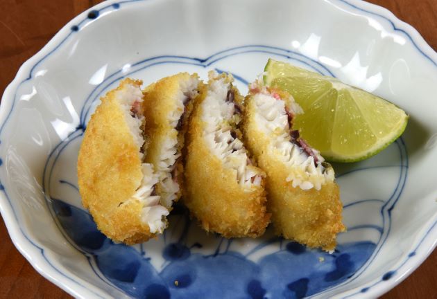 モンツキアカヒメジのフライ 上質な白身で熱を通しても硬く締まらない。皮に独特の風味がある。皮付きで揚げるとヒメジらしい味になるが、これは好みの問題かも。三枚に下ろして塩コショウして小麦粉をまぶし、衣(卵・小麦粉・少量の油・水)をからめ、パン粉をつけて短時間でさくっと揚げる。クリックで閉じます![]()