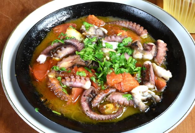 基本通り煮ゆでたヤナギダコの足、にんにく、トマト、にんにくなどを鉄のパンに乗せて、塩コショウする。オリーブオイルを加えてソテーする。香りづけにパセリなどを散らす。