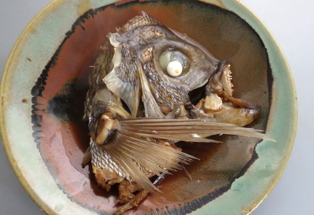 ヤンバルシマアオダイの ここでは兜を煮てみた。梨子割りにしてそのまま、湯通しする。冷水に落として残った鱗やぬめりを流して、水分をよくきる。これを酒・醤油・水で煮る。煮ても硬くならず身は豊潤に仕上がる。身離れがよく皮、身とも非常にうまい。クリックで閉じます![]()