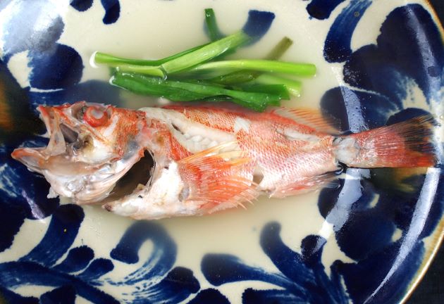 ユメカサゴの湯上げ(湯煮) 日本各地で水洗いした白身の魚をゆっくり煮上げるという料理がある。まーす煮、炒り煮の対岸にある料理で穏やかに火を通すことで、うま味や脂が煮汁に出てしまうのを防ぐ効果がある。ここでは昆布だしを使った。水洗いして肝だけを残す。水分をよくきし、ぬるま湯程度の昆布だし・酒・塩でゆっくり煮る。クリックで閉じます![]()