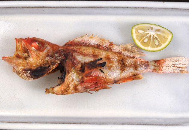 ユメカサゴの塩焼き 小振りのものは鱗を取り、内臓はずぼ抜きする。肝はまた腹に戻して振り塩をする。1時間以上置きじっくりと焼き上げる。少し水分が多いのが難点ではあるが、焼くと身の甘味が強まり、またそれほど硬く締まらないのもいい。非常にうまい。クリックで閉じます![]()