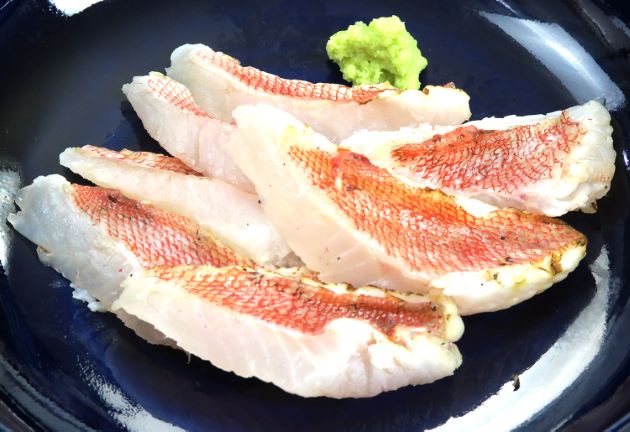 ユメカサゴの焼霜造り 歩留まり的に問題があるが生食にしてもいい。三枚に下ろして血合い骨を抜く。皮目をバーナーなどであぶり、氷水に落として水を拭き取る。水分をよくきり、刺身状に切ったもの。身にあぶった香ばしさ、甘みがあり心地よい食感が楽しめる。クリックで閉じます![]()