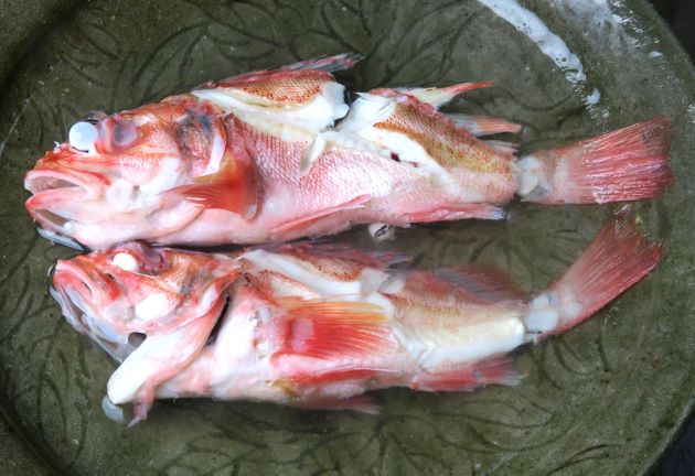 ユメカサゴの煮つけ 大型のものは半分に切って煮る。鱗を取り小振りのものは内臓をずぼ抜きにする。湯通しして冷水に落として残った鱗やぬめりを流す。これを酒・しょうゆ・水で煮る。しょうゆと酒は何度かにわけて加減する。みりん、砂糖など甘味を加えてもいい。上質な白身で煮ると適度にしまり、しょうゆ味に適度に煮染められる。煮染めても本来の甘味はそのままで、適度に繊維質の身が口の中でほどける。非常にうまい。