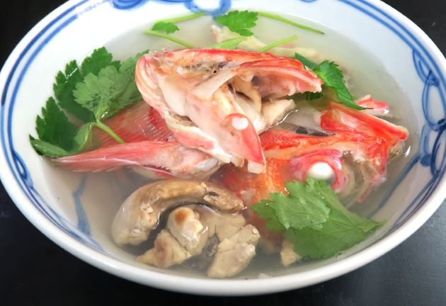ユメカサゴのあら汁(潮汁) 大型はあらを、小型は丸のまま使う。あら、肝、胃袋などを集めて湯通しする。冷水に落として鱗やぬめりなどを取る。これを昆布だし(水でも可)で煮出す。酒、塩で味つけする。うま味の強い汁になり、あらなどにつく身に甘みがある。クリックで閉じます![]()
