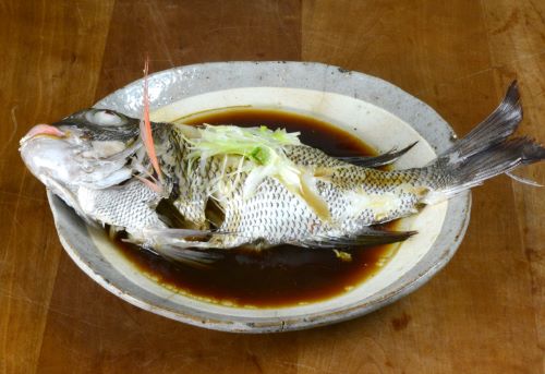 ヨコシマクロダイの蒸し魚(清蒸) 小型なら丸のまま大きいものは適当な大きさに切る。骨つき、頭部周りが合う。ていねいに水洗いする。鱗が残っているとダメなので徹底的に取る。水分をよくきり、皿に割り箸などを敷き乗せる。10〜15分蒸し、蒸魚鼓油もしくはタレ(醤油・紹興酒・魚醬・少量の砂糖)をかけて、場合によっては少し蒸す。これにねぎ、しょうがのせん切り、シャンサイ、などを乗せて煙が出るくらいに熱した油をじゅっとかけ回す。
