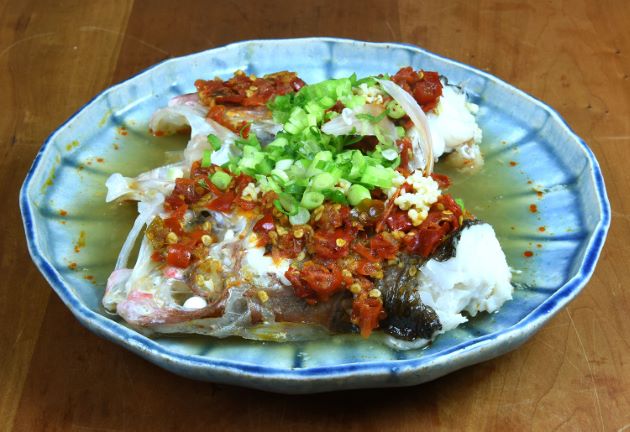 ひげだらの剁辣椒蒸(ヨロイイタチウオの蒸し物) 大小関わらず淡泊で上品な味ではあるが、小型はむしろ味のない魚と考えてもいい。ようするにスケトウダラのようにどのような料理にしてもおいしいということでもある。ここでは水洗いして開き水分をよくきる。ここに剁辣椒(湖南省などで作られている唐辛子の塩漬け)をのせて蒸し上げた。蒸し上げると身が絞まり、上品過ぎる味わいに唐辛子の辛さ、うま味が加わる。クリックで閉じます![]()