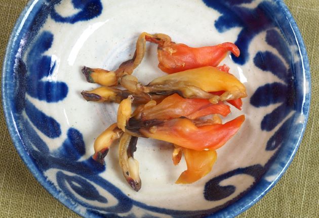 姫貝 バカガイの干もの、「姫貝」は日本各地で作られているが年年生産量が減っている。非常に濃厚なうま味と、微かな甘味をともなった渋味が感じられて食べ始めると止められなくなる。写真は三重県伊勢湾周辺で作られているもの。クリックで閉じます![]()
