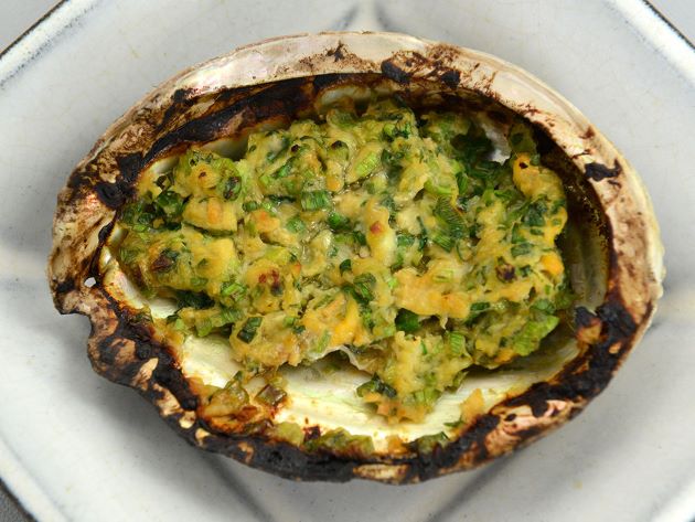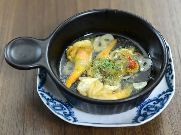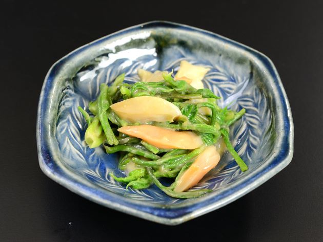 青柳のぬた(バカガイのぬた) 青柳(バカガイ)の舌切りとコシアブラ(わけぎで作るのが一般的)を酢みそで和えた。コシアブラの渋みと苦み、歯触りが青柳とおっつかっつのせめぎ合いを演じて、実に味わい深い。香り高い、わけぎ、甘草、菜花(のらぼう)など春の山菜や野菜を合わせて楽しむべし。クリックで閉じます![]()