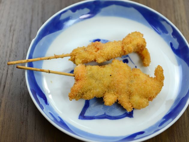 バカガイのフライ 瀬戸内海や東京湾周辺の一般家庭で作られていたもの。軟体部分の内臓を取り去り、串に刺して小麦粉をまぶして、卵にくぐらせて、パン粉をつけて揚げたもの。じっくり揚げると火が通り硬くなり、油が跳ねるので高温で短時間揚げるといい。クリックで閉じます![]()