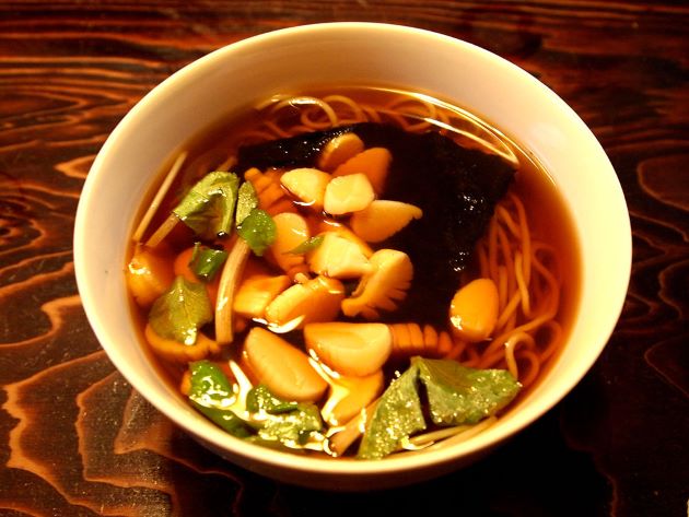 あられそば 東京の老舗そば屋では一般的なもの。かけそばに小柱を散らす。『守貞謾稿』(天保8年〜幕末まで)に「あられ ばかと云う貝の柱をそばの上に加うを云う」がある。そば屋の品書きのなかでももっとも高価なものとなっているが、江戸時代はどうだったのだろう。[室町 砂場など都内のそば店]クリックで閉じます![]()
